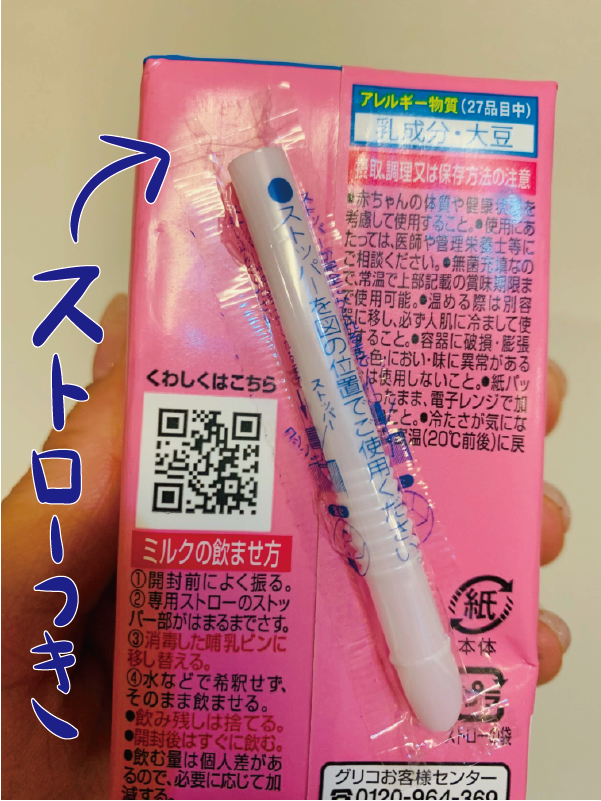 後ろにはご丁寧にストローまでつけてくれていた。もしかしてストローで飲めるから哺乳瓶すらいらないの!?って思ってたら、哺乳瓶に移し替える用のストローらしいです。気づかなくてハサミであけて移し替えた。