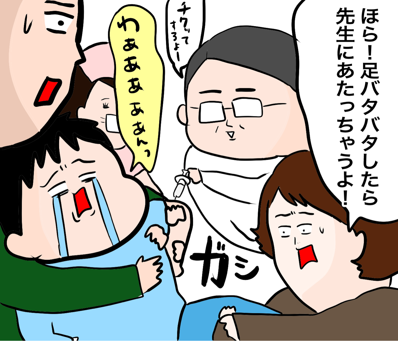 大人3人がかりで押さえつけギャーギャーと鳴き声が響き渡る診察室とは裏腹に